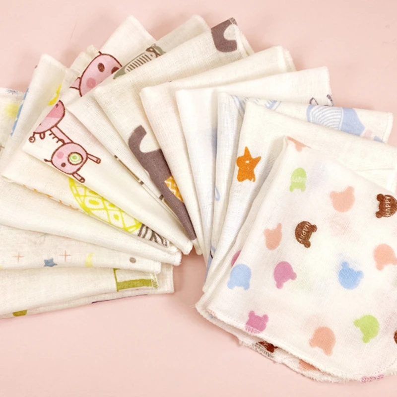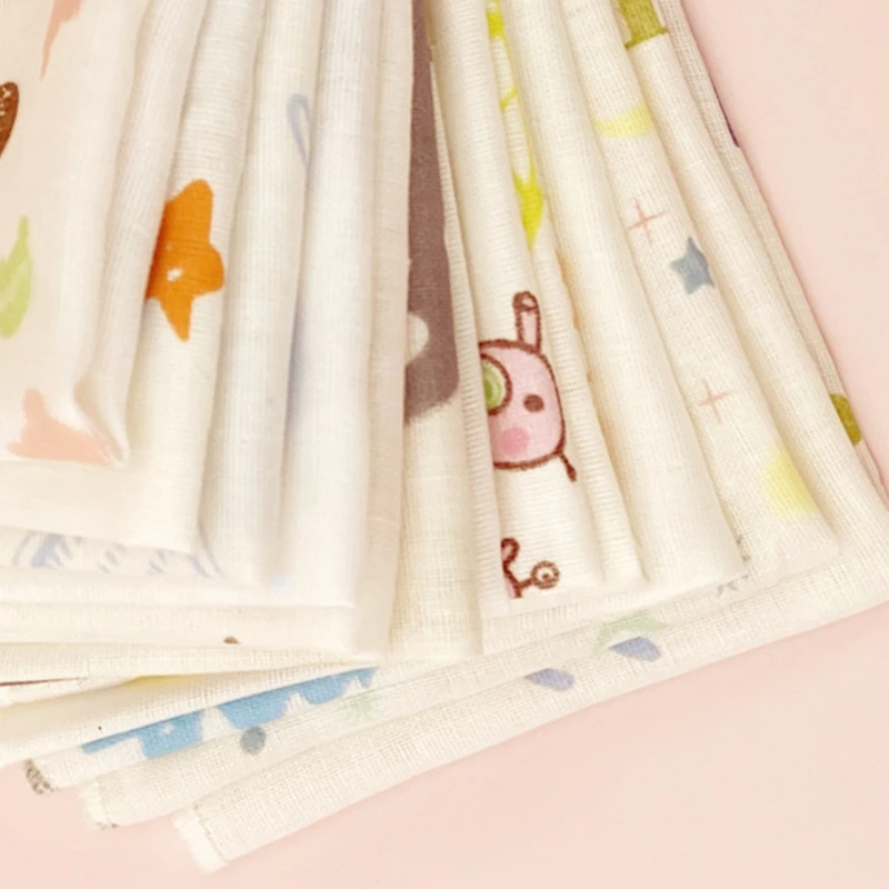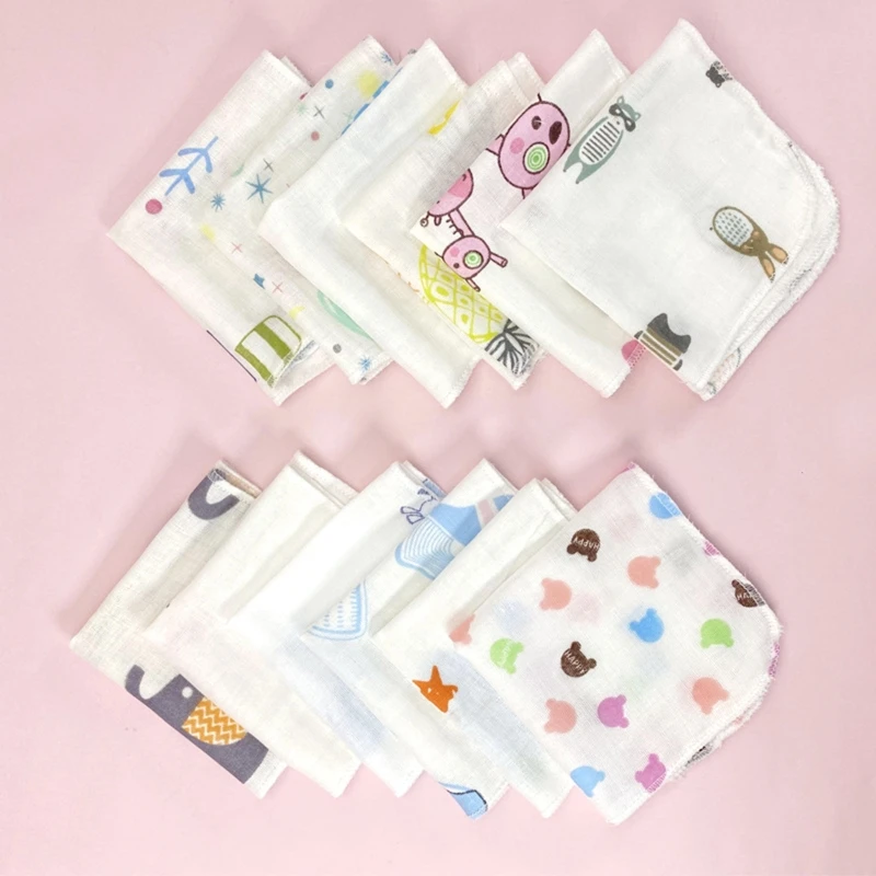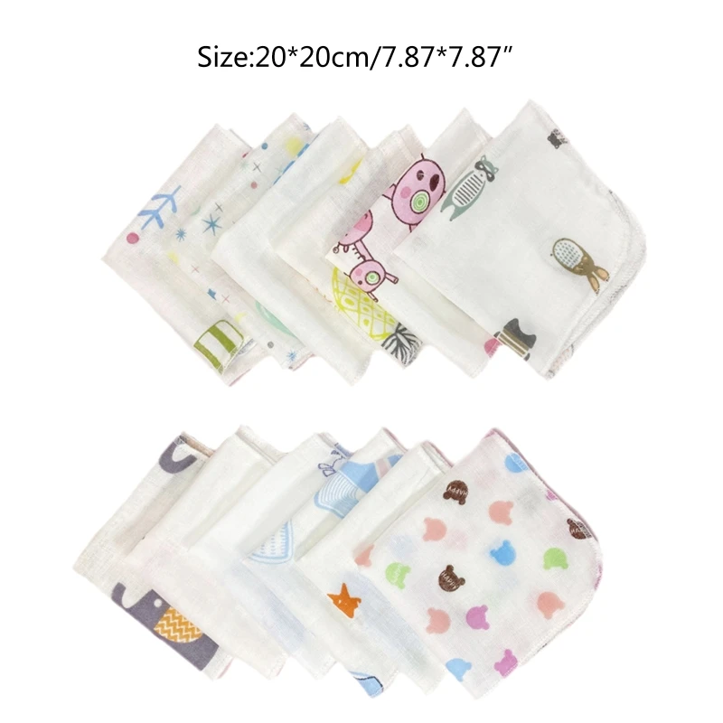 Make daily baby care easier with this 10-piece baby washcloth set featuring cute cartoon prints. Made from soft double-layer gauze, these square cloths are highly absorbent, breathable, and gentle on delicate skin. Perfect for use as face towels, burp cloths, handkerchiefs, or feeding wipes, they are ideal for newborns and infants. Lightweight, quick-drying, and easy to wash, this versatile set is a must-have for everyday baby care. Random assorted designs included.