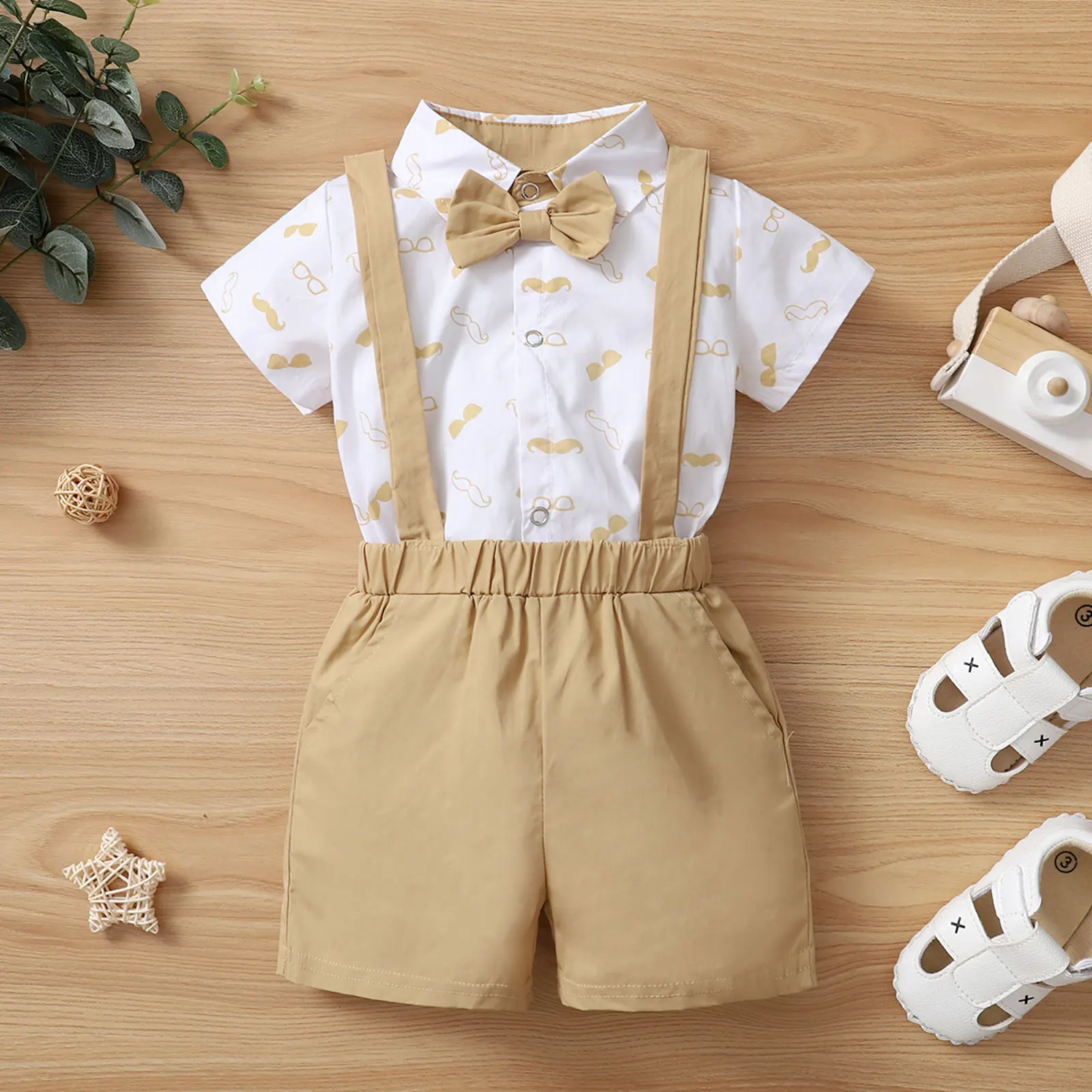 Dress your little gentleman in style with this adorable Baby Boy Suspender Shorts Set. Featuring a charming beard-print lapel shirt paired with classic solid suspender shorts, this outfit blends playful design with dressy baby fashion. Made from soft, breathable fabric, it keeps your toddler comfy during warm summer days. The short-sleeve shirt adds a cute touch, while the adjustable suspenders give the outfit a timeless look perfect for photos, outings, or special events. Ideal for newborns, infants, and toddlers, this casual yet polished set makes dressing up easy and fun. Whether for everyday wear or a special occasion, this cute babywear set is a stylish must-have for your little boy’s wardrobe.