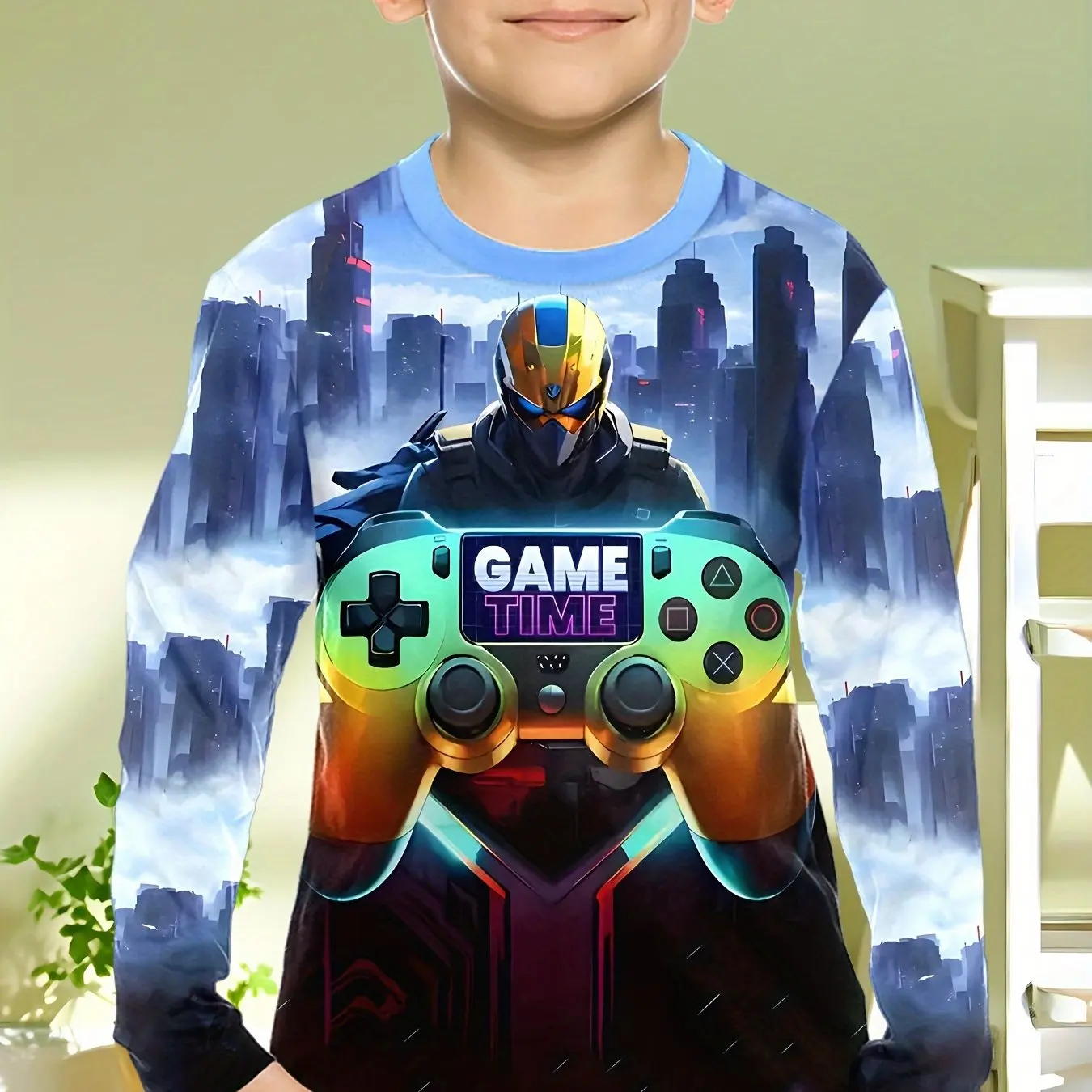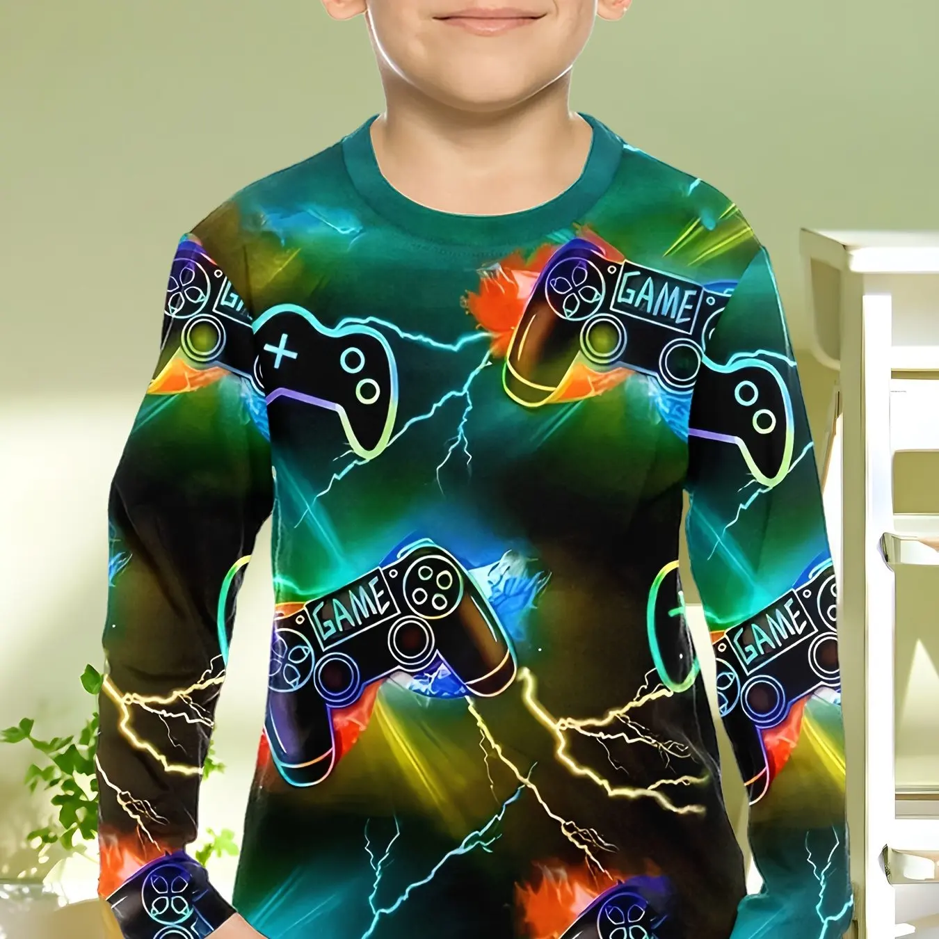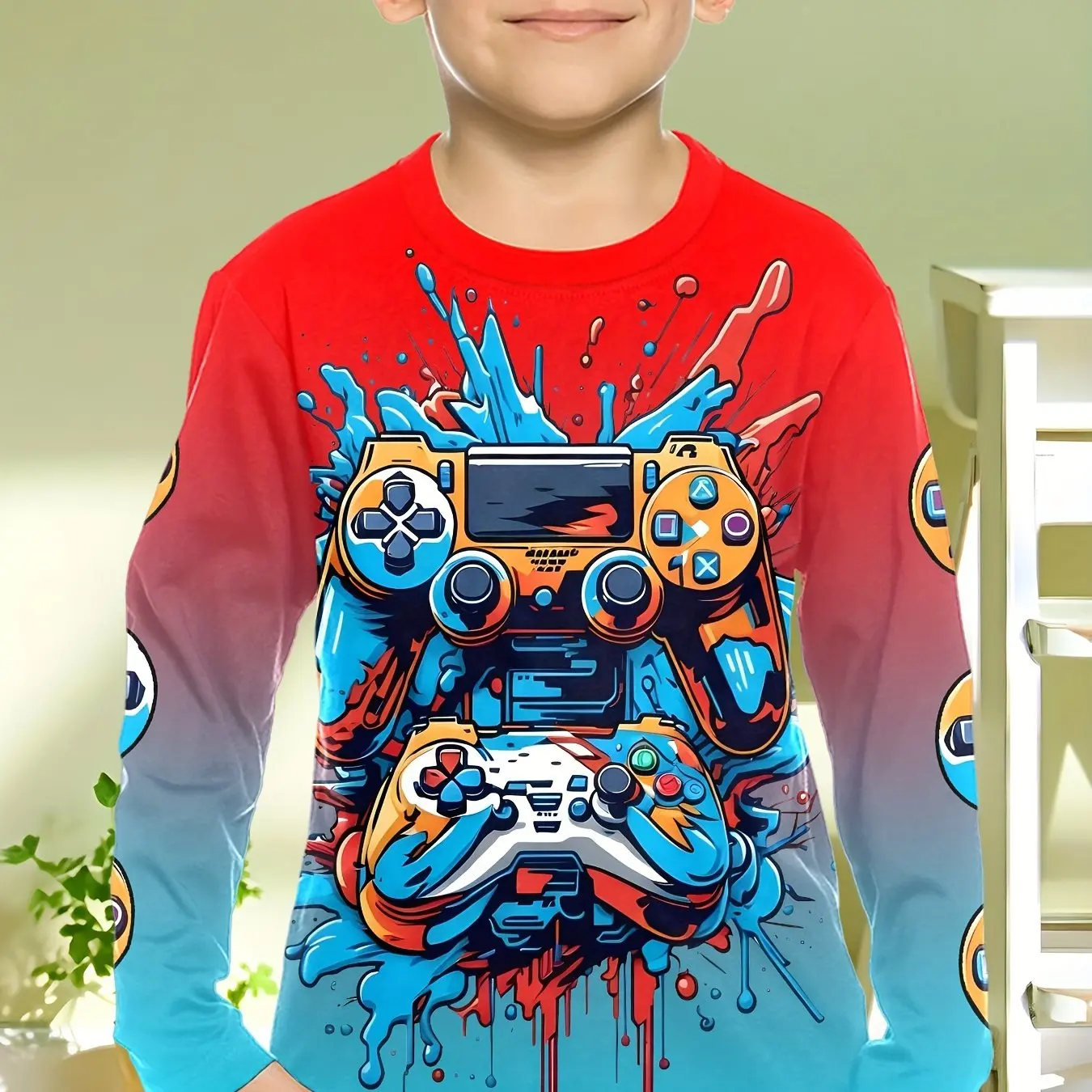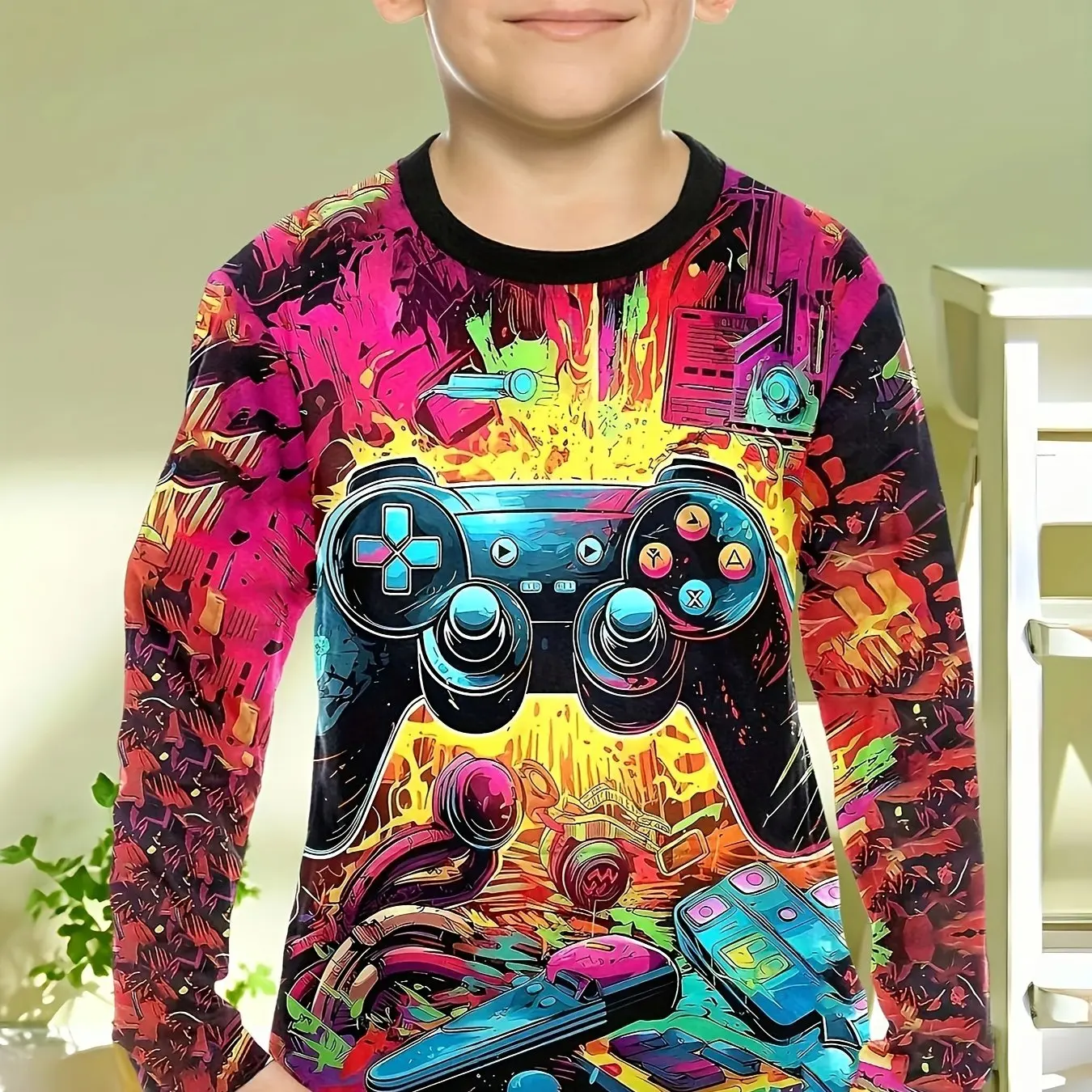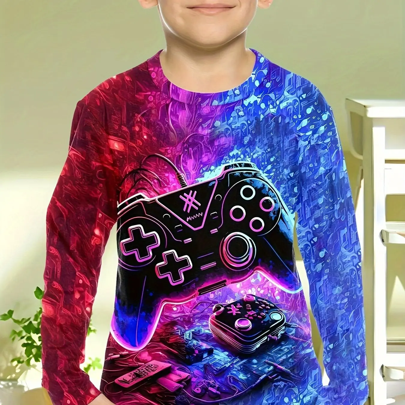 This children’s long-sleeve T-shirt features a cool gamepad pattern, perfect for young gaming enthusiasts. Made from soft, breathable fabric, it provides comfort for spring and fall wear. The classic O-neck design and casual fit make it ideal for school, playdates, or daily outings. Suitable for boys of various ages, this novelty top adds fun and style to any kid’s wardrobe and pairs easily with jeans, pants, or shorts.