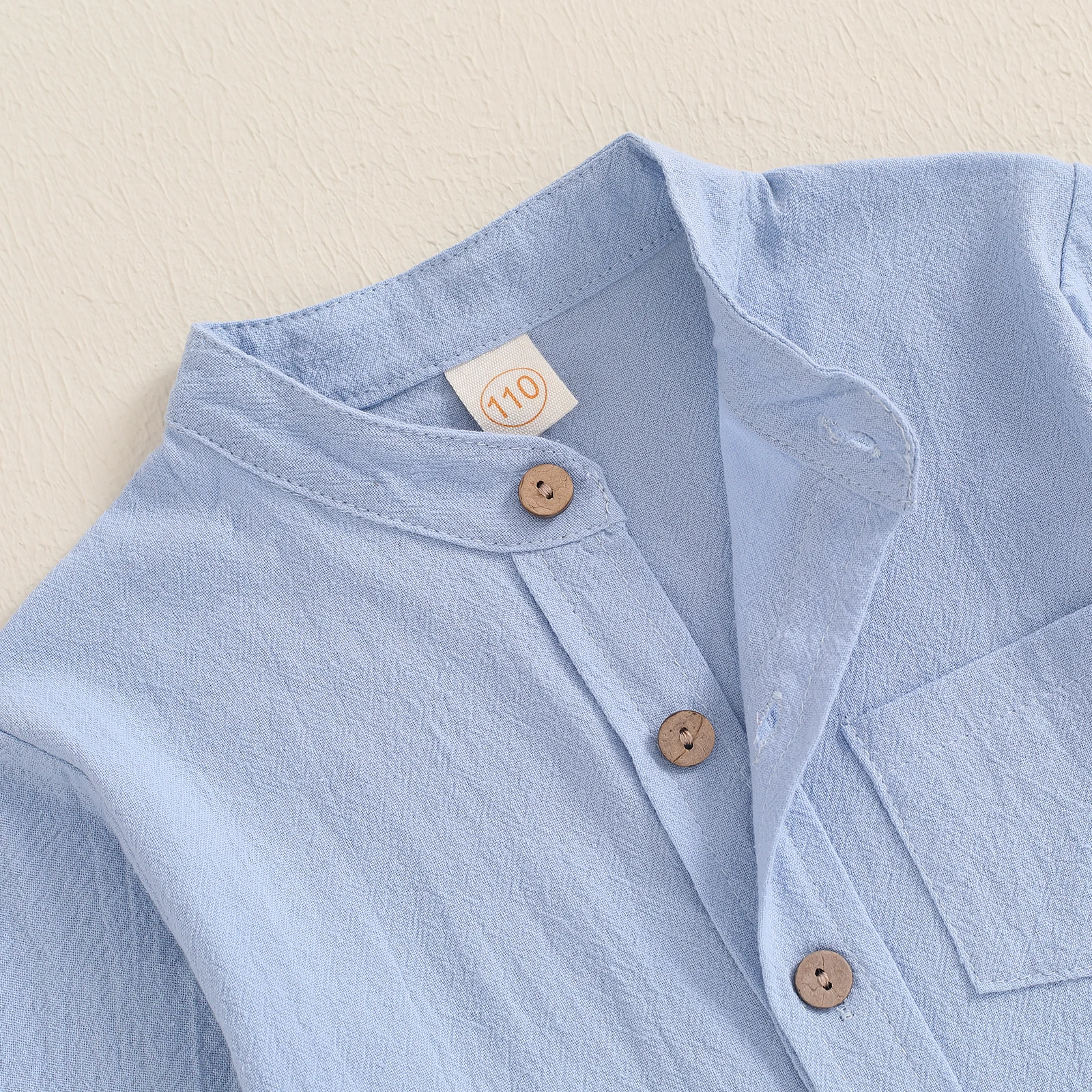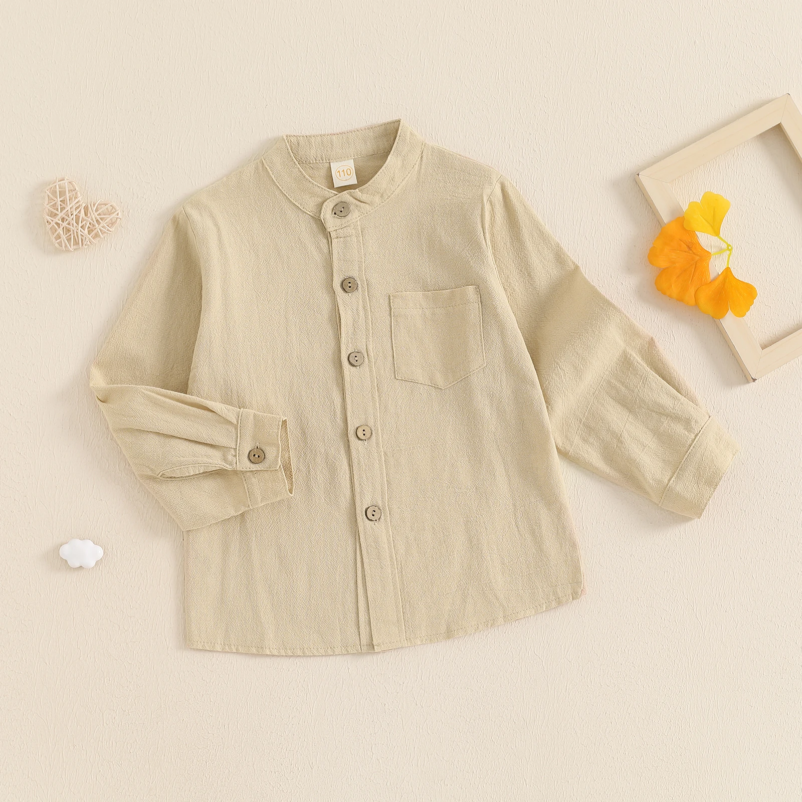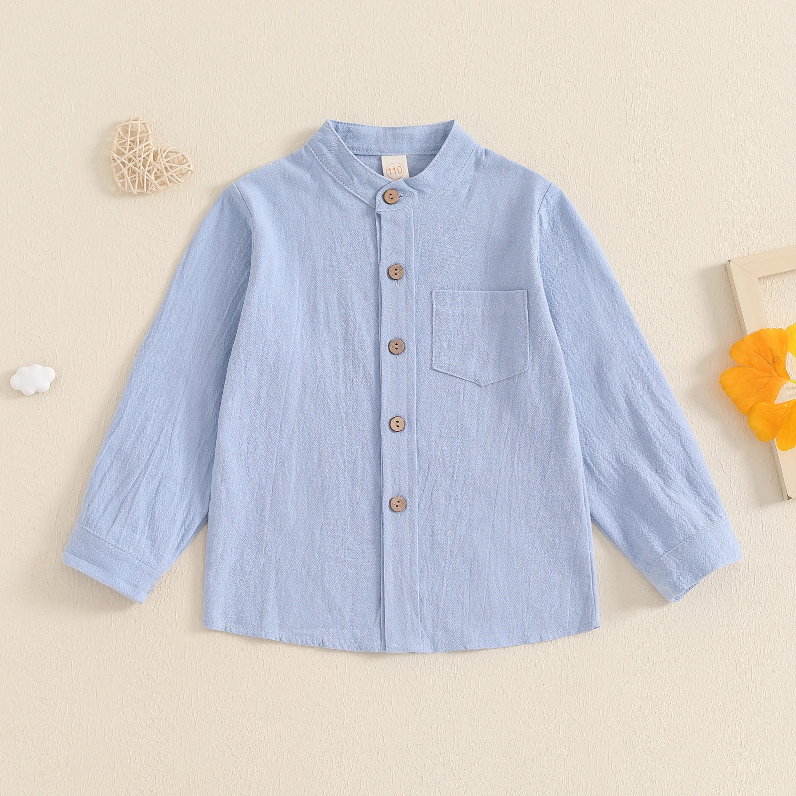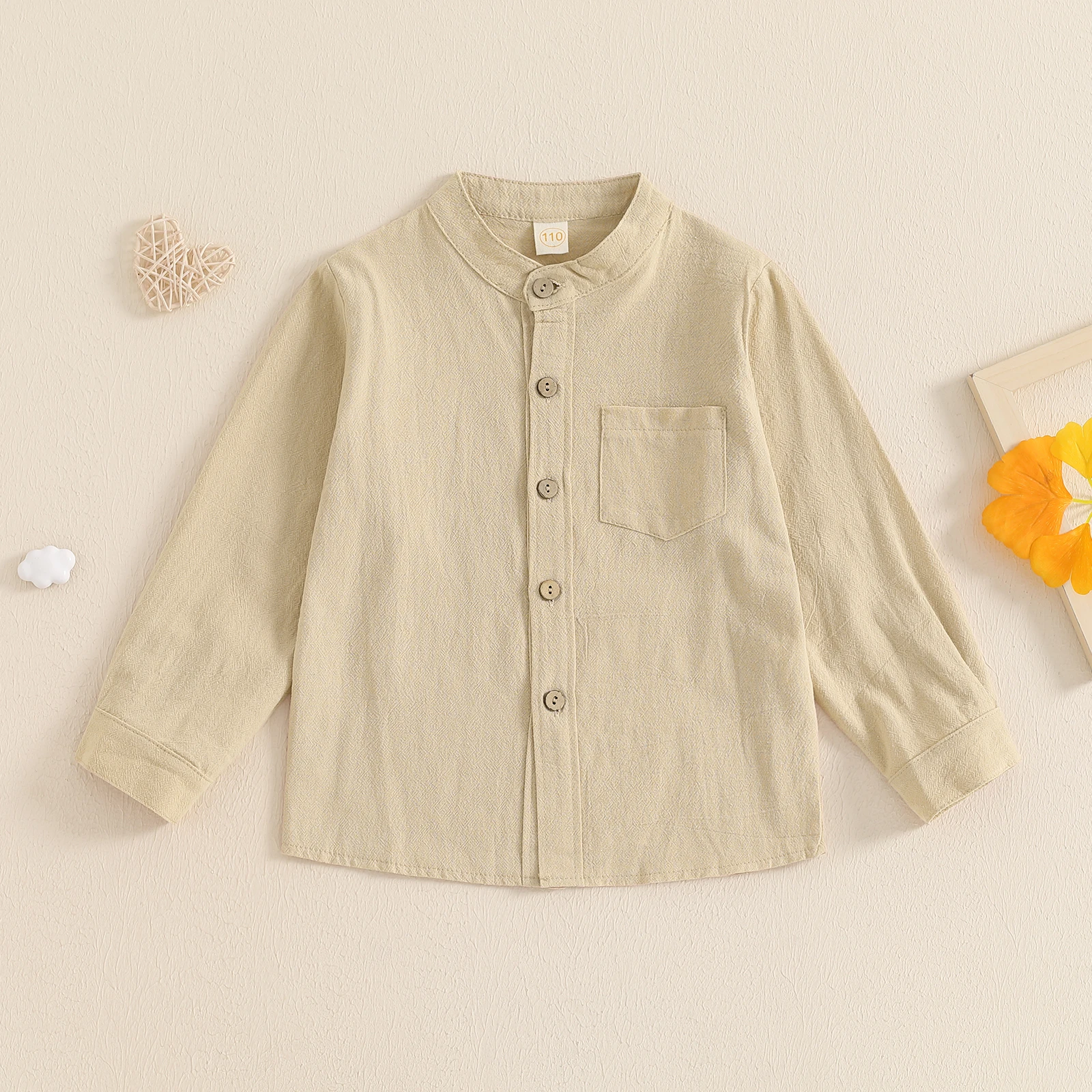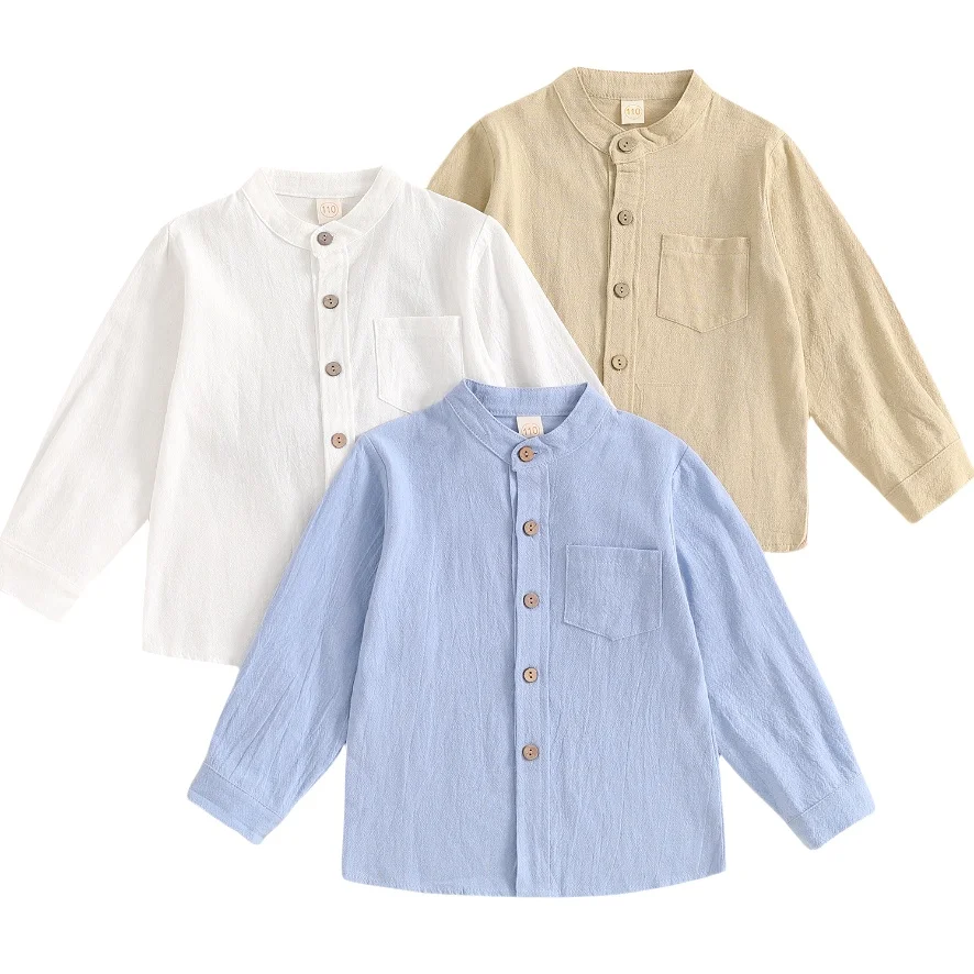 This little boy solid color button-up shirt features a stylish stand collar and classic chest pocket for a smart, gentleman look. Made from soft, breathable fabric, it offers all-day comfort and easy wear for spring and fall seasons. The long sleeves and front button design make it perfect for casual outings, school, family gatherings, or special occasions. Easy to match with jeans, trousers, or suspenders, this versatile shirt is a must-have addition to any boy’s wardrobe.