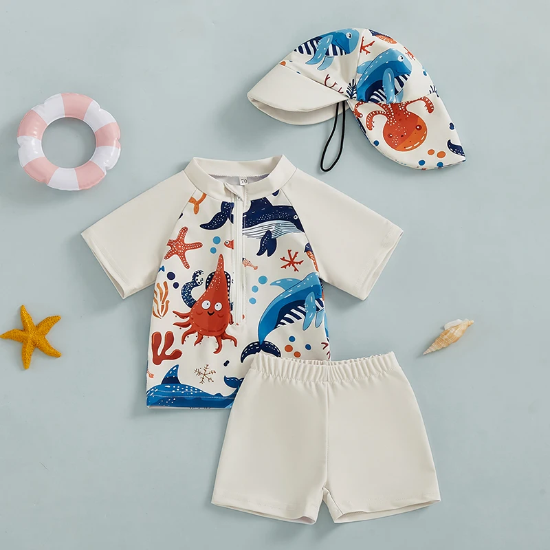 Get your little one ready for sunny adventures with this kids baby boys 3-piece swimsuit set. Designed for ages 0–5 years, this adorable beachwear set includes a cute print short-sleeve zipper rash guard top, matching swim trunks, and a coordinating hat for extra sun protection.