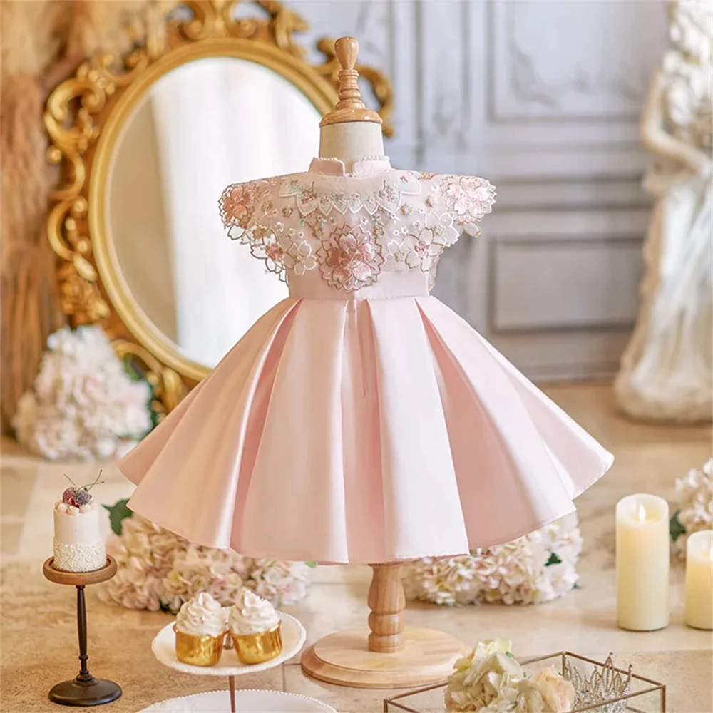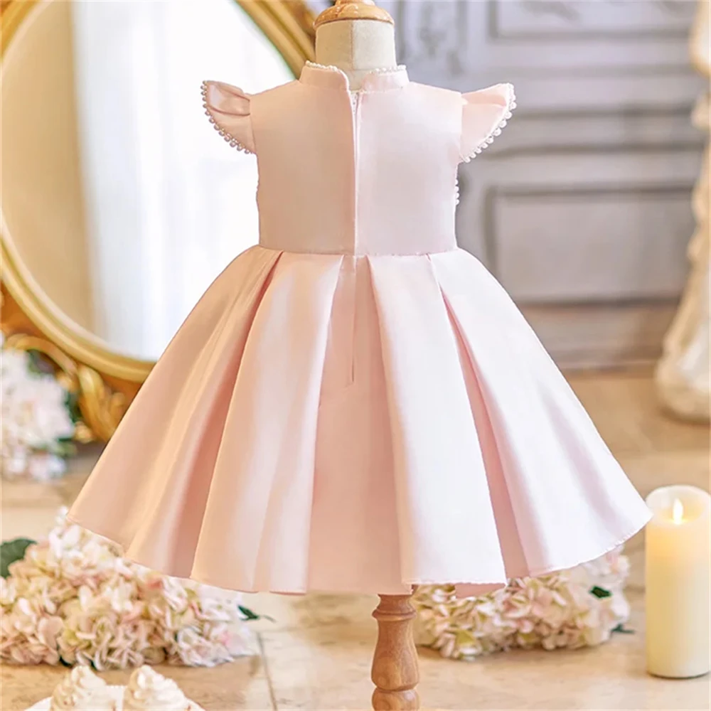 Make your little one shine with this elegant flower girl dress. Crafted from smooth satin, it features delicate appliques and pearl accents for a charming, sophisticated look. The sleeveless, high-waist design ensures comfort while keeping her stylish for weddings, birthdays, or first communion celebrations. Available in various sizes for girls, this gown is perfect for creating unforgettable special moments.
