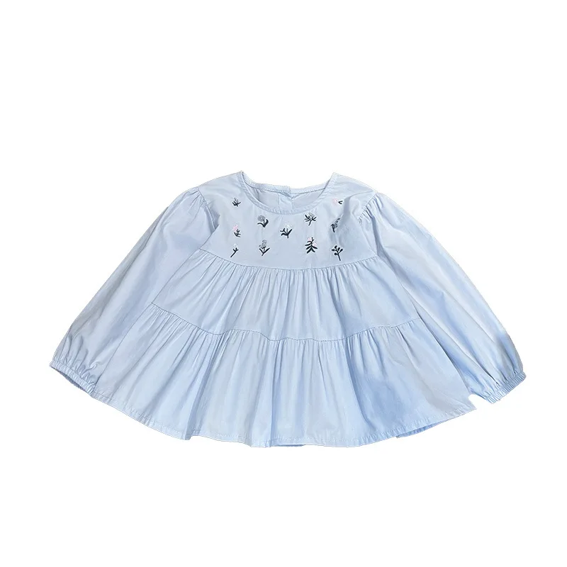 This autumn girls’ blouse features delicate flower embroidery and a charming French-style design for a sweet, elegant look. Made from soft, breathable cotton, it’s comfortable for infants, toddlers, and young girls. The pullover style makes dressing easy, while the classic blue color adds a gentle, timeless touch. Perfect for everyday wear, outings, or special occasions, this embroidered top pairs beautifully with skirts, leggings, or pants for a cozy and stylish fall outfit.