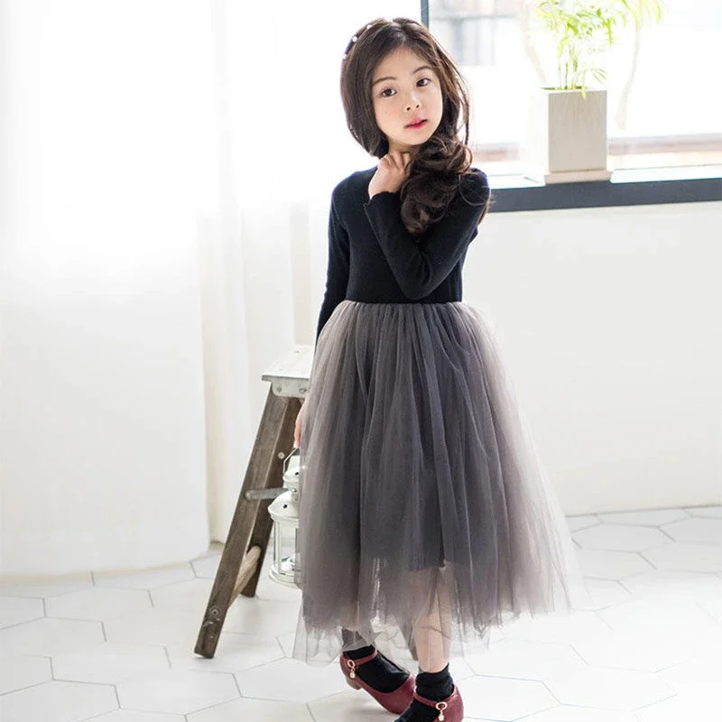This girls’ princess dress features elegant long sleeves and a soft, fluffy gauze skirt for a dreamy look.