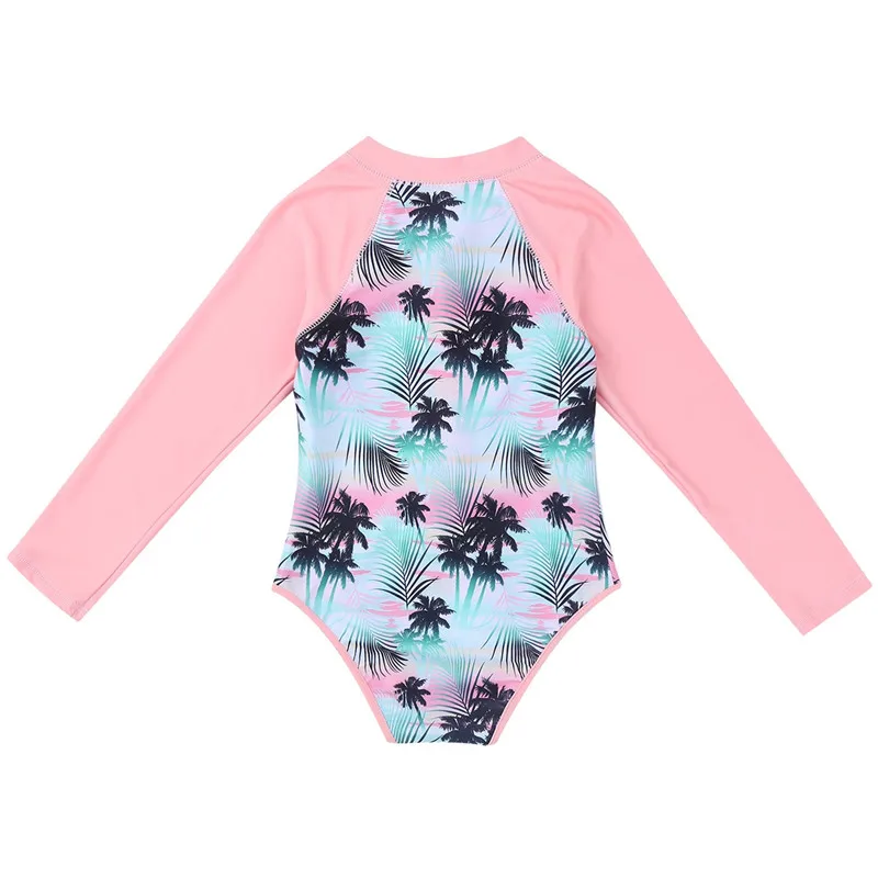Combine style and sun protection with this Summer Swimming One-Piece Rashguard Swimsuit for kids. Featuring a fun palm print and long sleeves, it keeps young swimmers safe from harmful UV rays while enjoying the pool or beach.