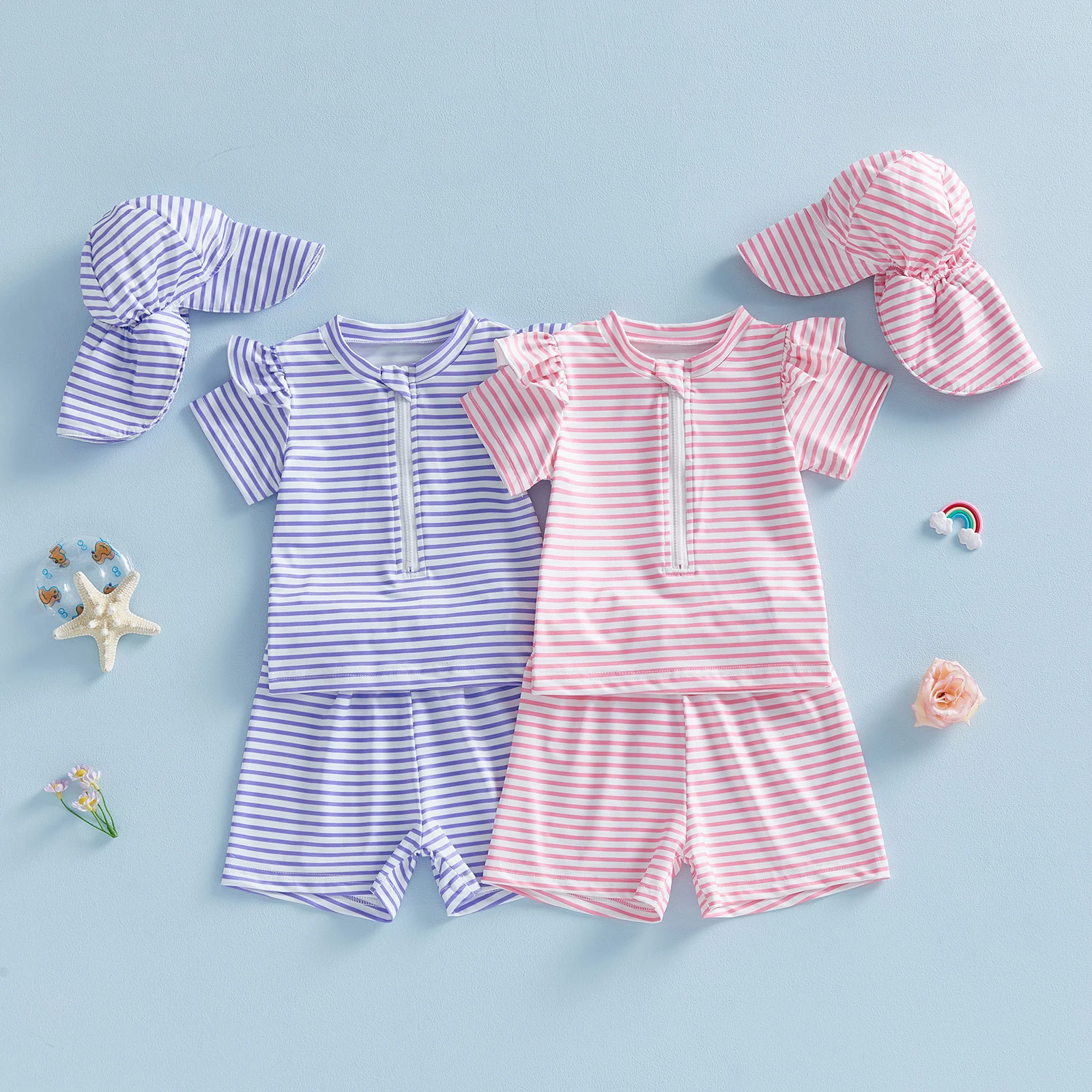 Crafted from soft, stretchy, quick-dry fabric, it keeps your little one comfortable during swimming and water play. The short sleeve top provides light coverage, while the elastic waistband shorts ensure a secure and flexible fit. The matching hat adds extra sun protection and completes the stylish beach look.