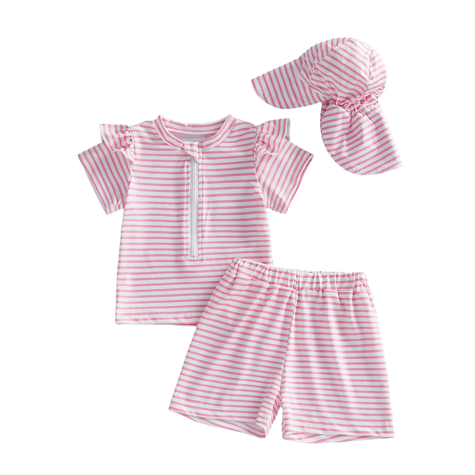 Make pool and beach days extra cute with this 3-4T Little Girls Three-Piece Swimsuit Set! Featuring a striped short sleeve round neck top, comfortable matching swim shorts, and an adorable coordinating hat, this outfit is perfect for sunny adventures.
