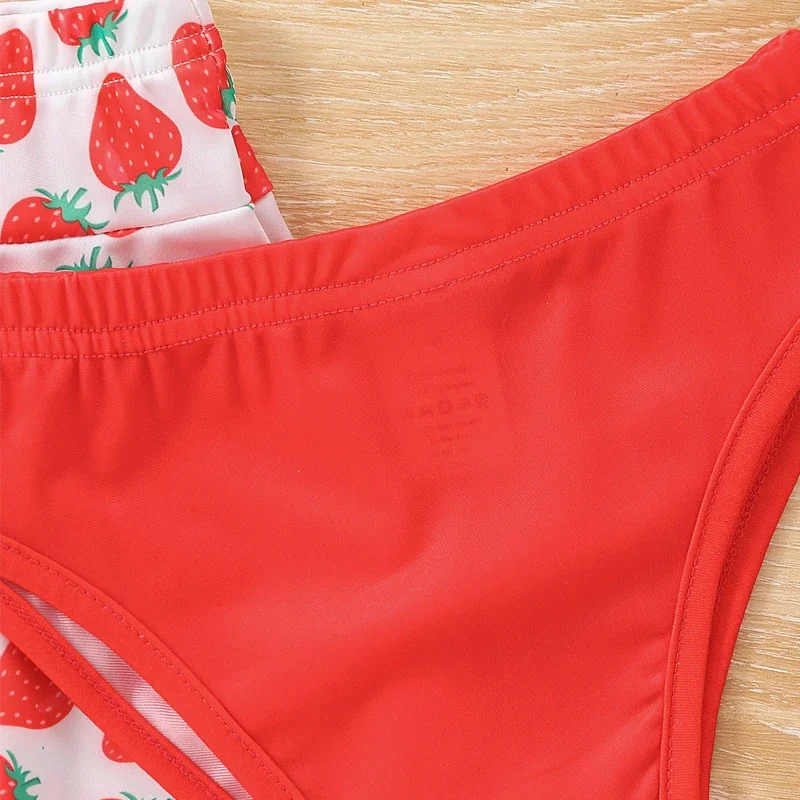 Sweet, playful, and perfect for summer fun! This Children’s Three-Piece Swimsuit Set features an adorable strawberry printing pattern paired with charming floral designs for a bright and cheerful beach look.