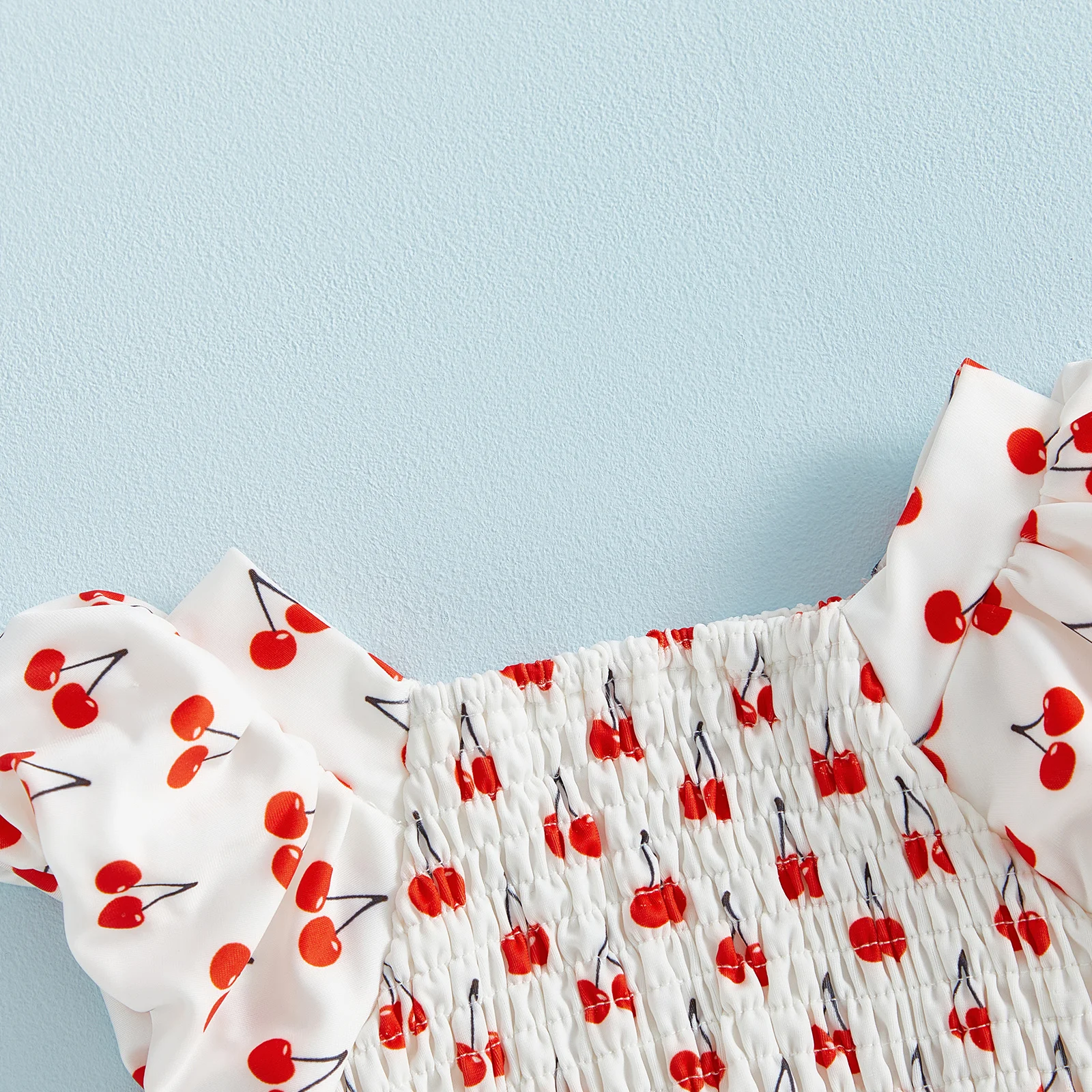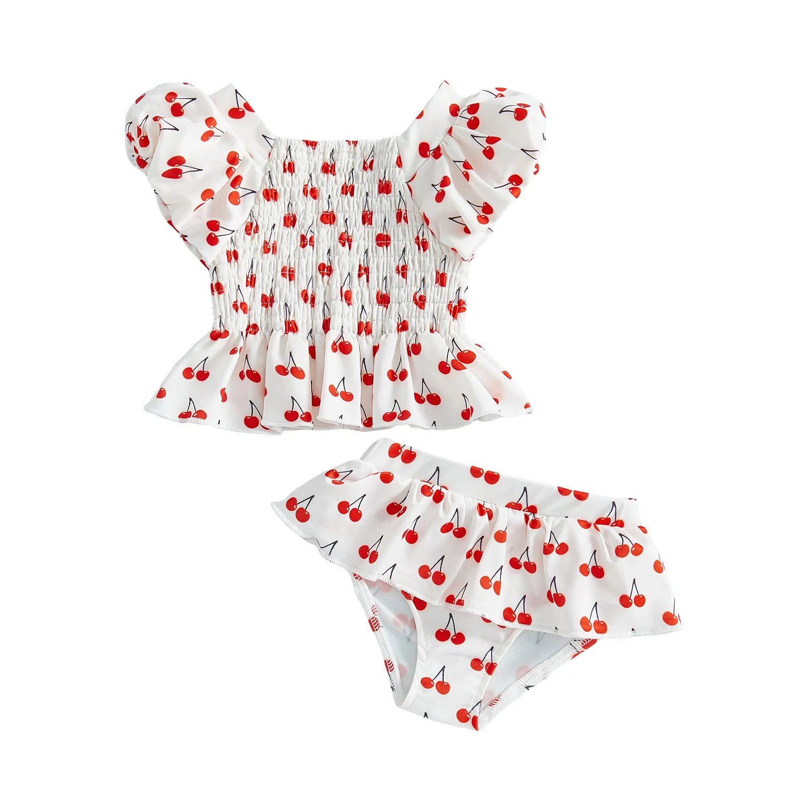 Dress your little one in sweet summer style with this adorable Two-Piece Cherry Print Swimsuit for toddler baby girls. Designed for ages 3M–3T, this charming set features a smocked short sleeve top with delicate ruffled trim and a matching bottom for a cute and coordinated beach look.