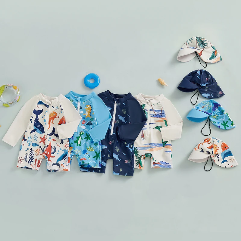 Keep your little one safe and stylish at the beach or pool with this adorable 2-piece shark print swim set! Designed for toddlers aged 0–5 years, it features a long-sleeve rash guard with a convenient half-zip closure for easy wear and quick drying. The matching sun hat provides extra protection from harmful UV rays, making it perfect for sunny days. Made from soft, stretchy, and lightweight fabric, this set ensures comfort, freedom of movement, and full sun protection during water play. Ideal for pools, beaches, and summer adventures!