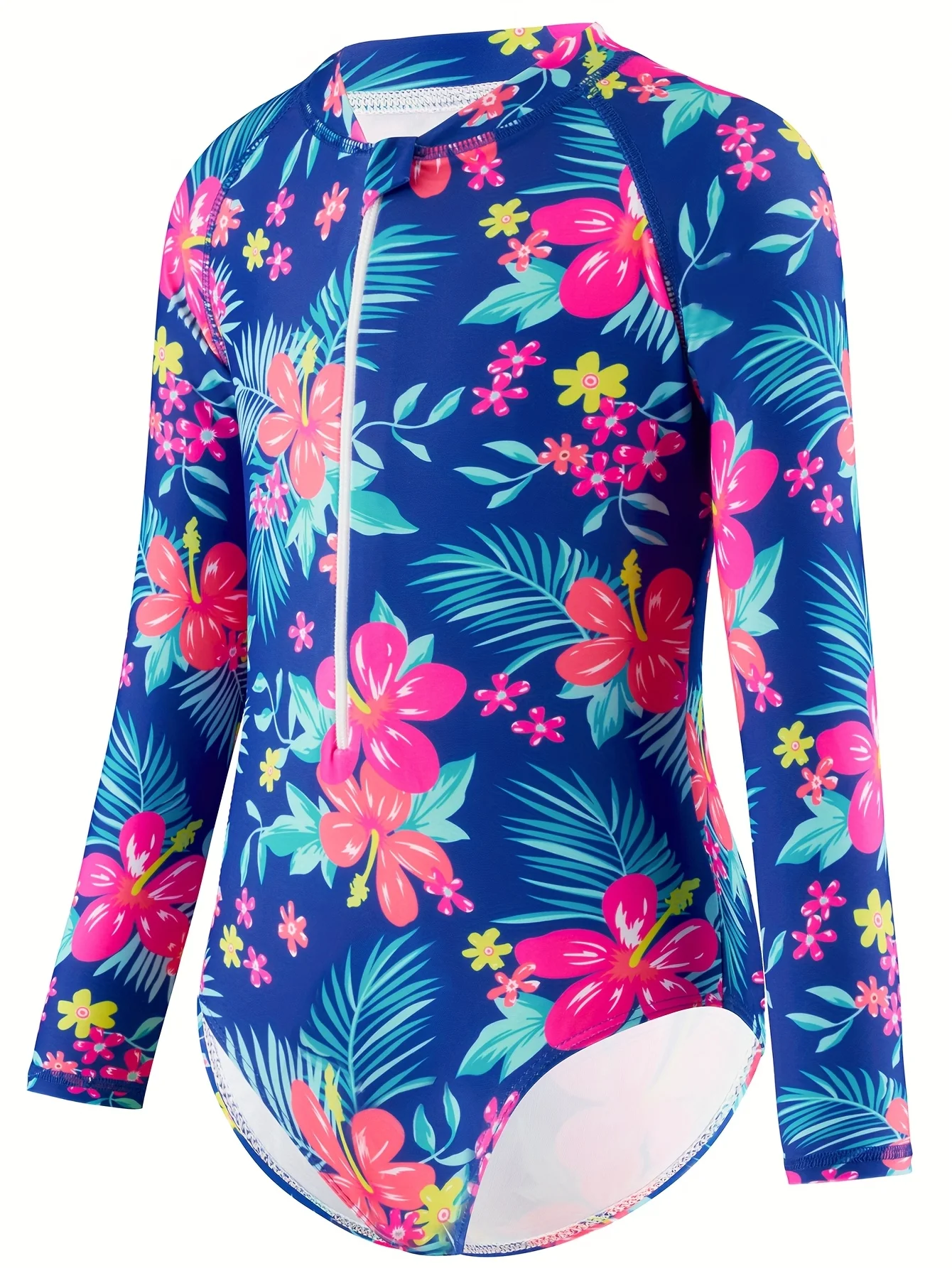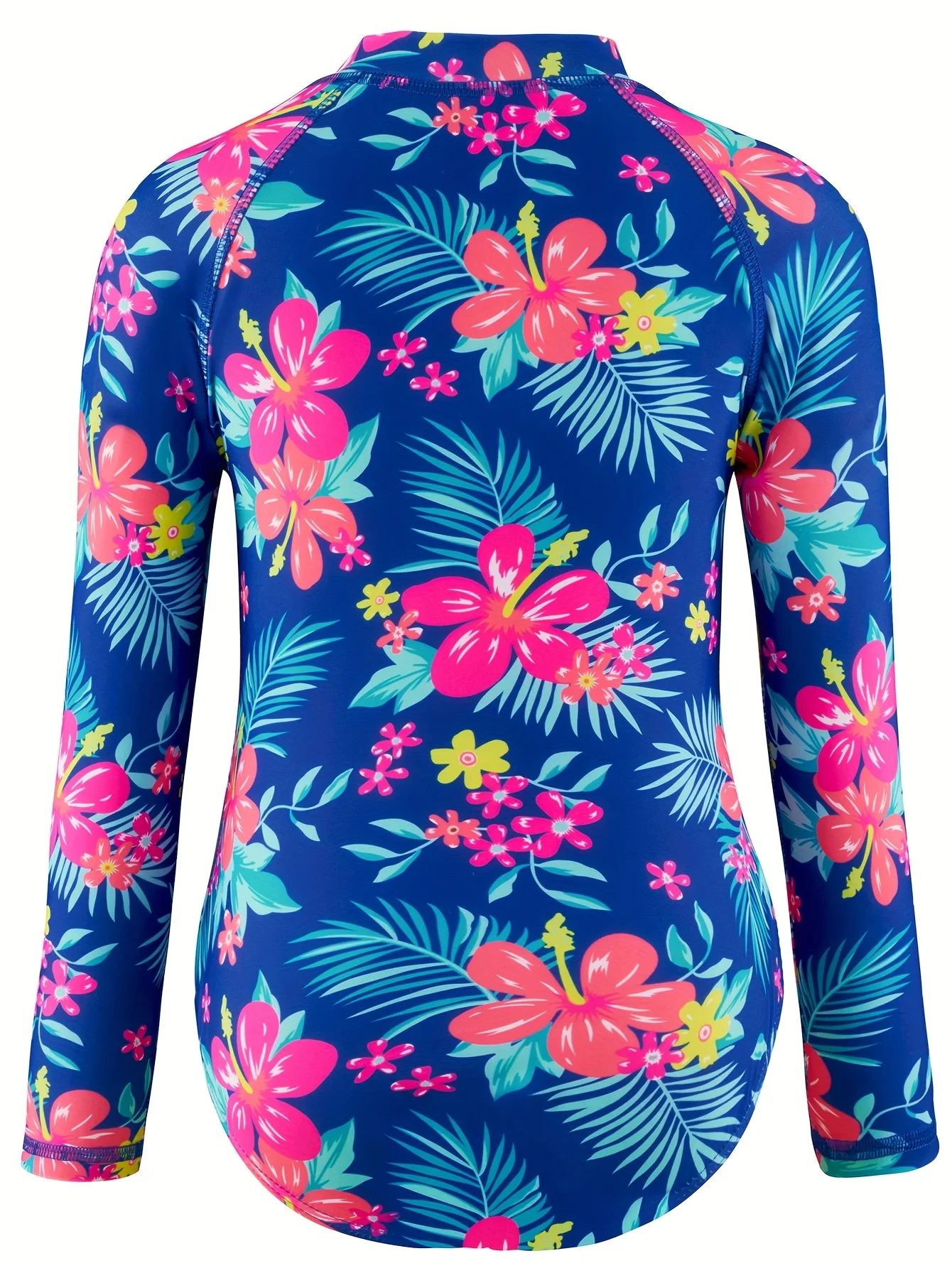 Brighten up her swim days with this Girls Tropical Hibiscus Floral Long Sleeve Swimsuit! Featuring a vibrant floral print and convenient front zipper design, this one-piece bathing suit blends tropical style with everyday practicality.
