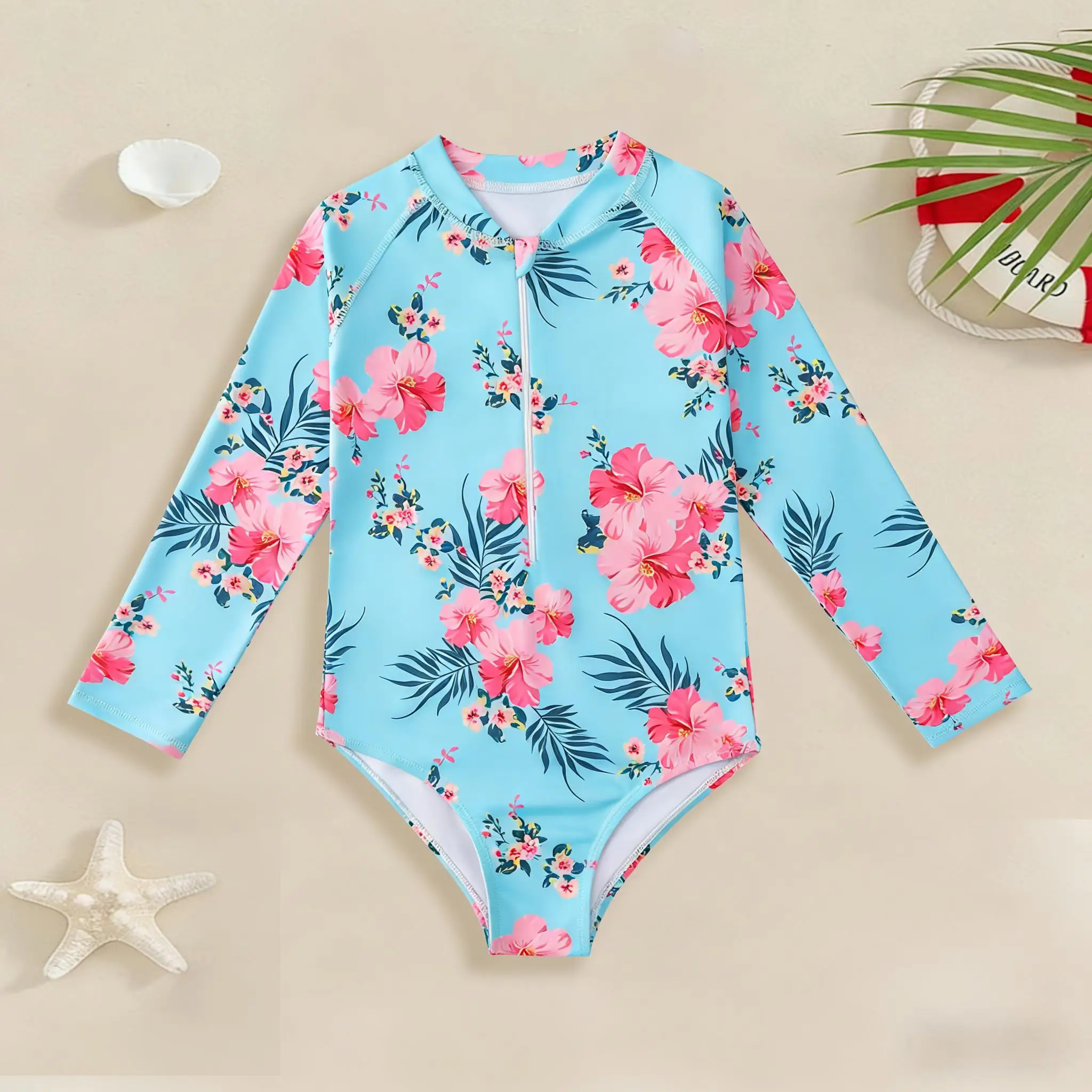 Bring island vibes to every swim day with this Trendy Girls Tropical Hibiscus Swimsuit. Featuring a beautiful light blue base with vibrant hibiscus floral prints, this long sleeve bathing suit is perfect for beach and resort vacations.