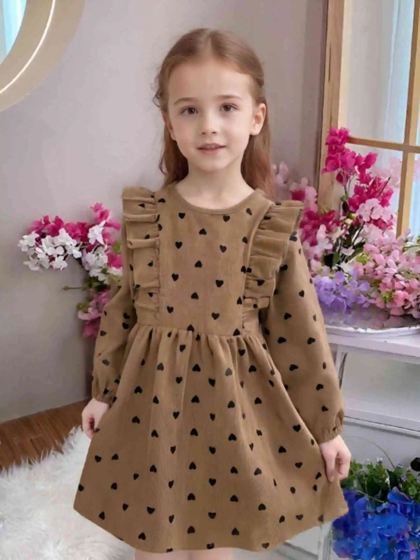 This charming dress combines vintage elegance with playful style, perfect for spring and autumn wear. Designed for young girls, it features a sweet love print and delicate double-fold lace for a soft, feminine touch. The long sleeves and loose fit provide comfort and freedom of movement throughout the day. Lightweight and breathable, it’s ideal for casual outings, family gatherings, or birthday parties. The dress’s gentle pastel tones and subtle details create a simple yet sophisticated look. Easy to pair with leggings or tights for cooler days. Its playful design makes it a favorite for everyday wear while keeping a refined style. Crafted with soft, durable fabric to ensure lasting comfort. A versatile addition to any girl’s wardrobe, balancing elegance and fun. Perfect for little girls who love stylish and comfy outfits.